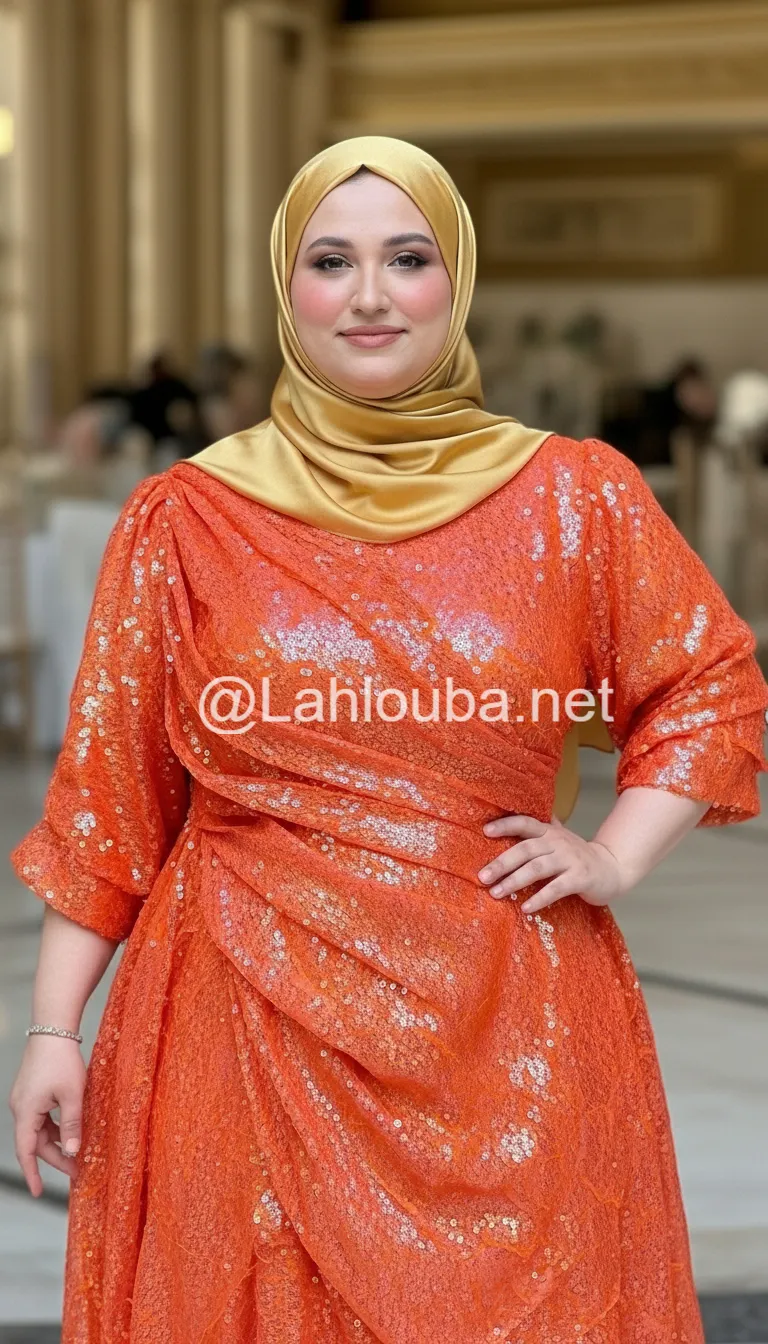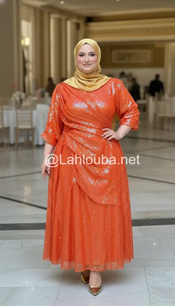 نقطة القوة: اللون الجريء والقصة الذكية. اللون البرتقالي يخطف الأنظار، والدرابيه الجانبي هو حليف رائع لتحديد الخصر وإخفاء أي بروز في منطقة البطن بذكاء.