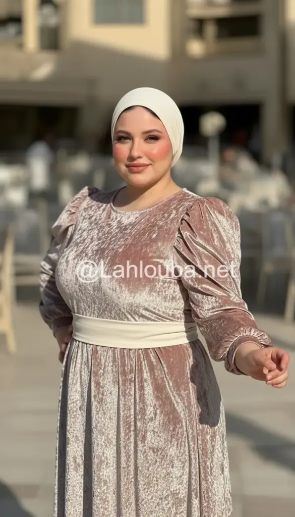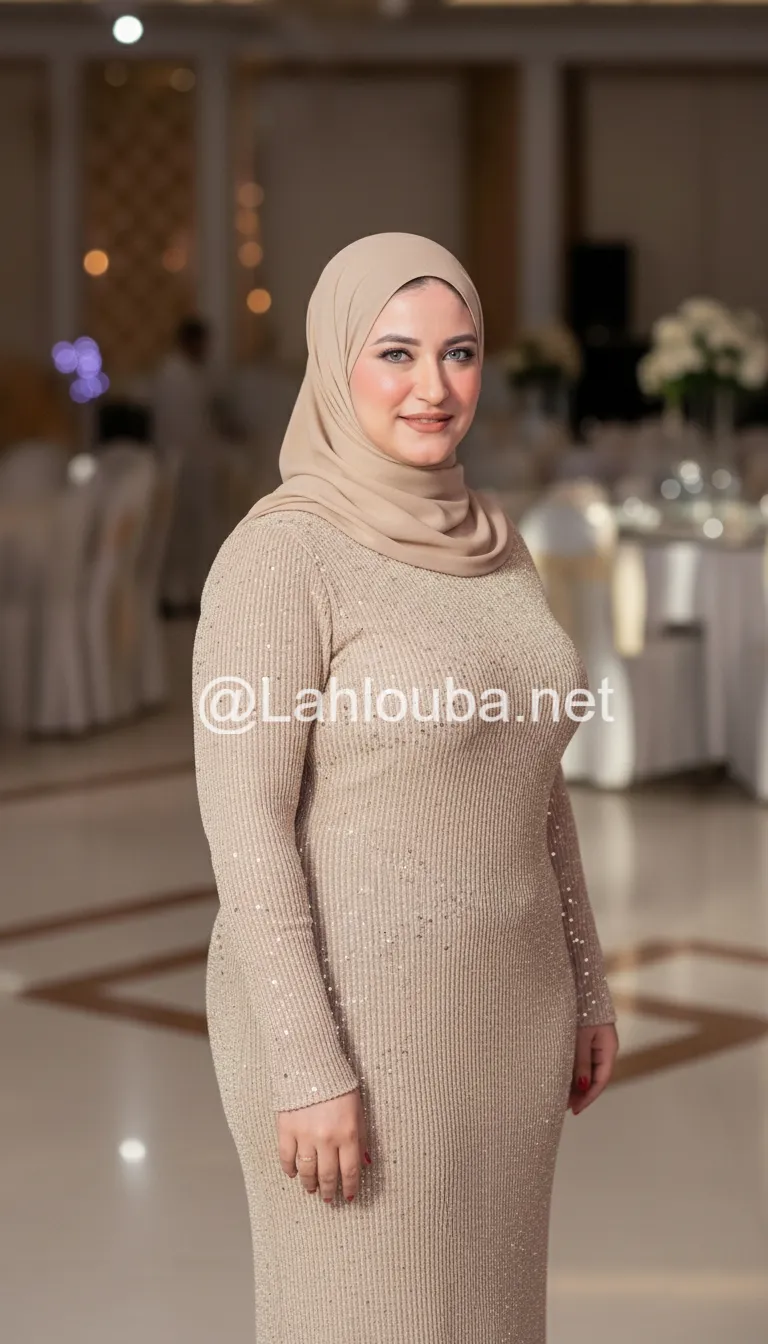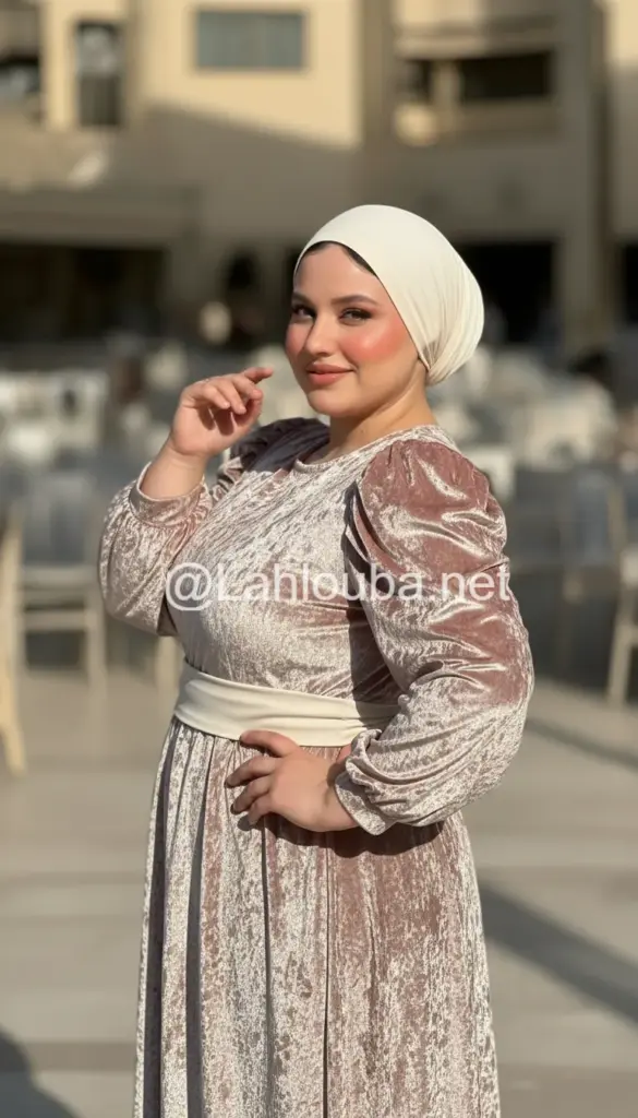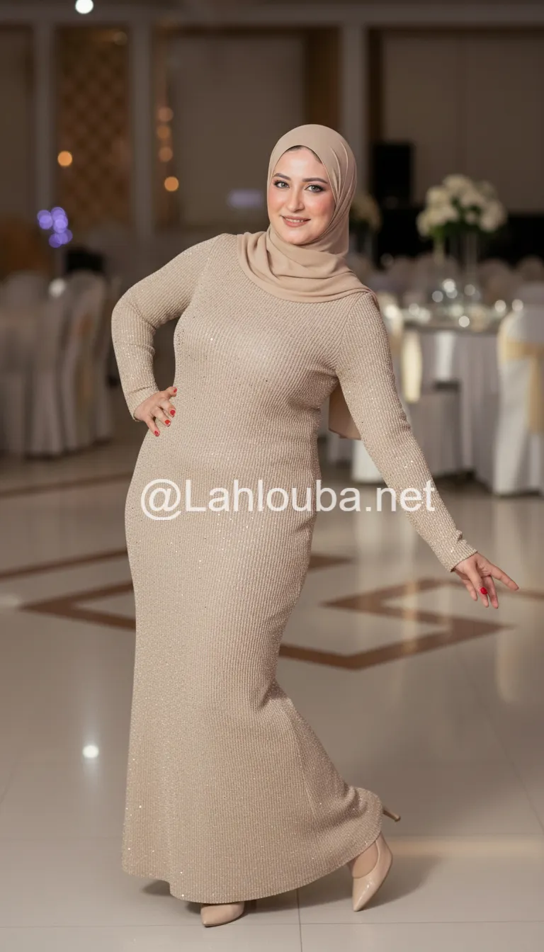 نقطة القوة: هذه الإطلالة تثبت أن القصة المثالية هي كل ما تحتاجينه. الفستان يبرز جمال القوام دون أي مبالغة، واللون البيج مع الحجاب المتطابق يمنح مظهراً راقياً وهادئاً.