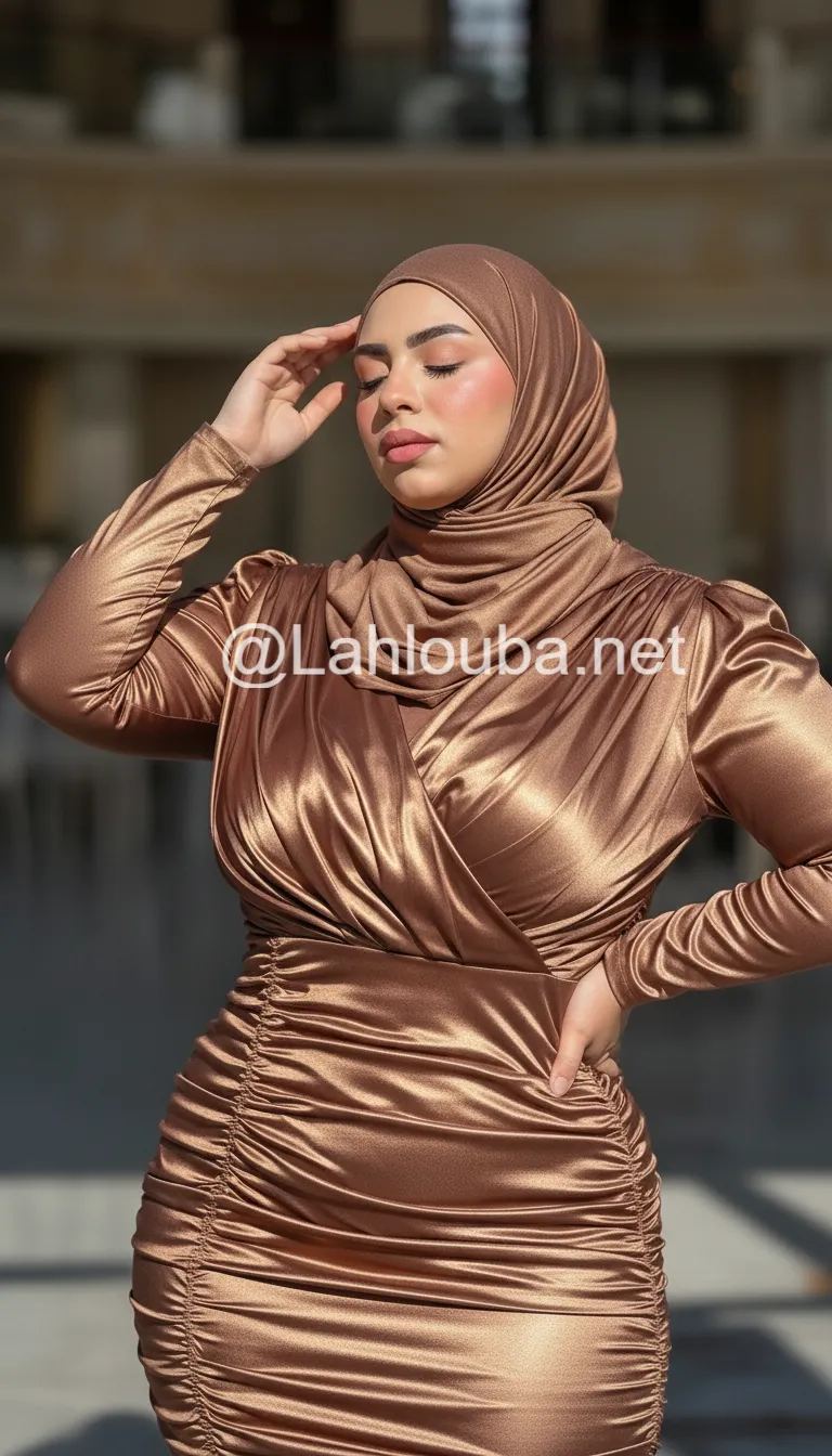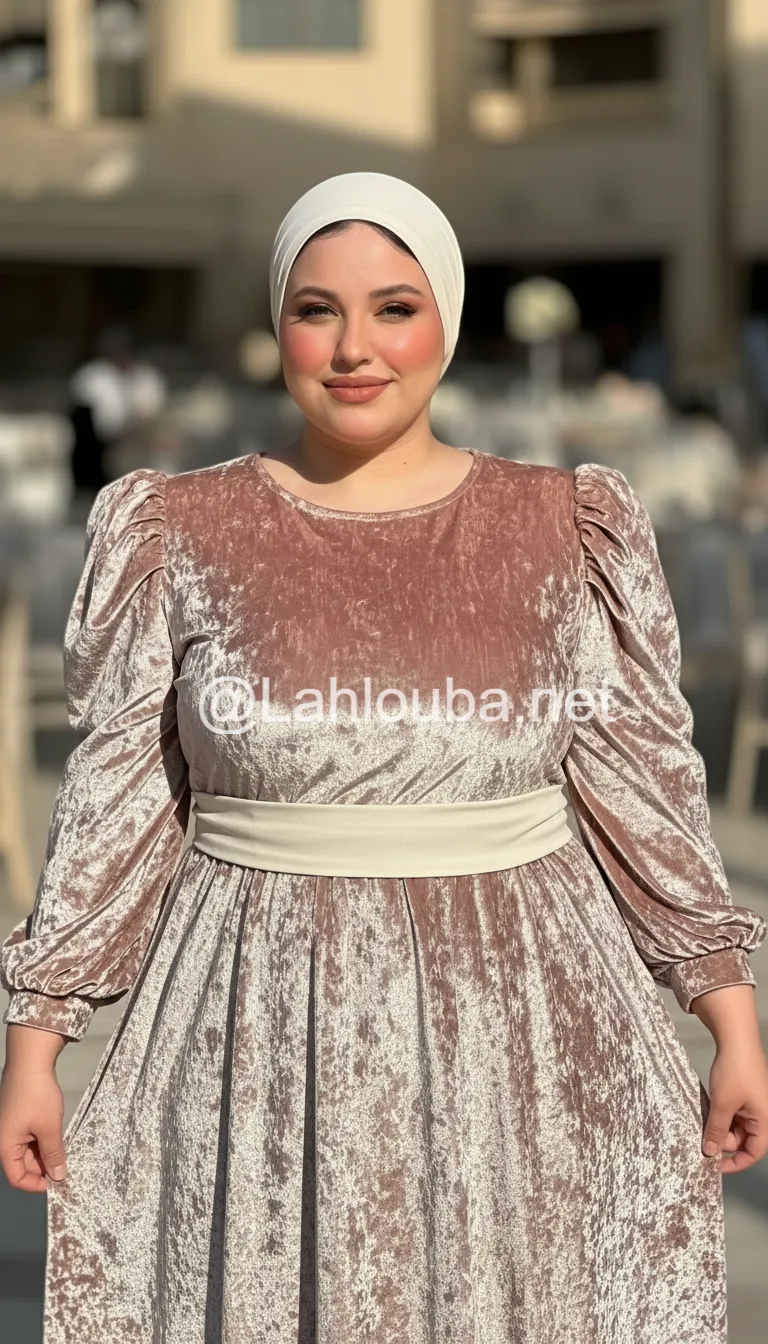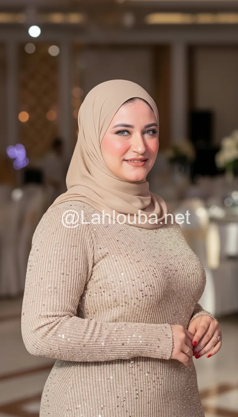 نقطة القوة: هذه الإطلالة تثبت أن القصة المثالية هي كل ما تحتاجينه. الفستان يبرز جمال القوام دون أي مبالغة، واللون البيج مع الحجاب المتطابق يمنح مظهراً راقياً وهادئاً.