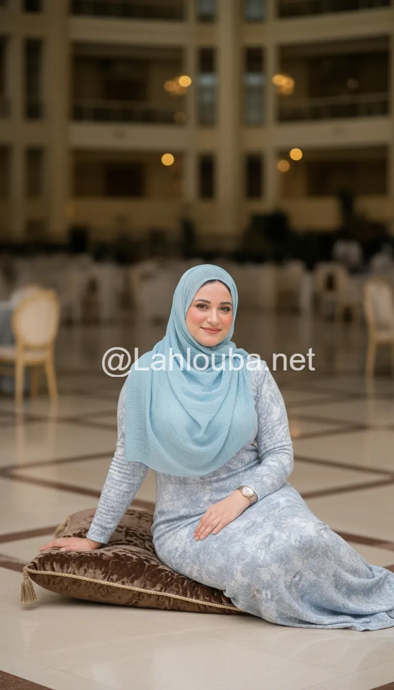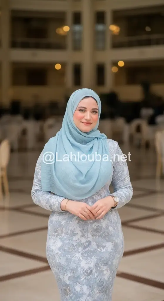 نقطة القوة: النعومة الكلاسيكية. اللون الهادئ مع فخامة الدانتيل يقدم إطلالة راقية جداً، وتنسيق الحجاب بلون أزرق مطابق يكمل اللوك بهدوء وأناقة.