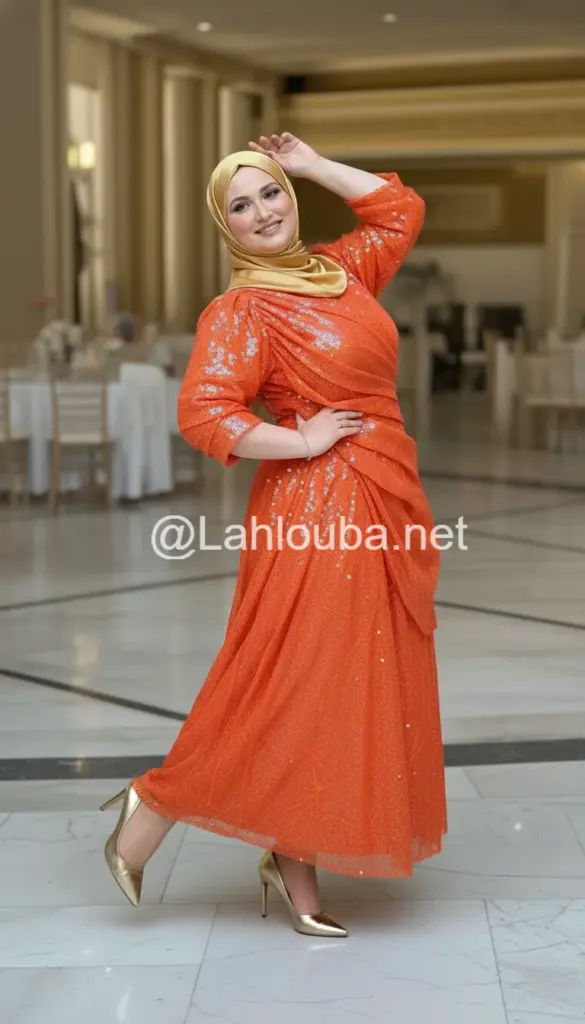 الوصف: فستان سهرة بلون برتقالي ناري، من خامة لامعة (تحتوي على الترتر الخفيف)، مع قصة “درابيه” جانبية عند الخصر.