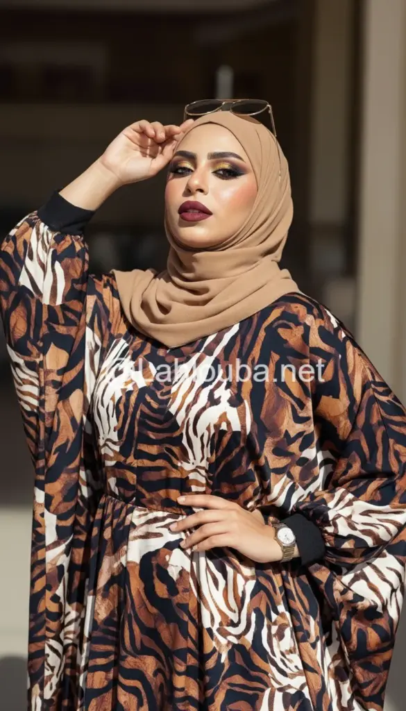 نقطة القوة: ترويض النقشة الجريئة. تحديد الخصر بالحزام هو حركة ذكية تحول الفستان الفضفاض إلى قطعة أنيقة تبرز القوام، وتمنع النقشة الجريئة من أن تكون “مزدحمة” بصرياً.