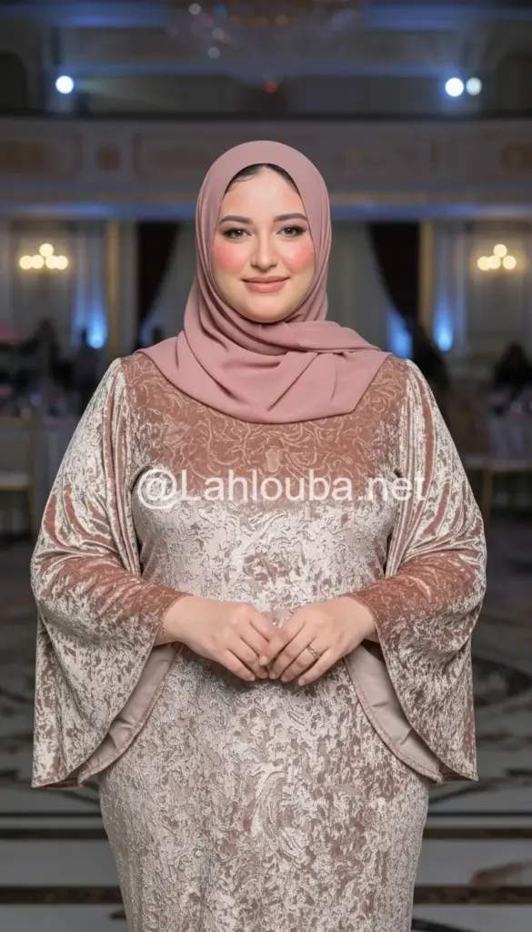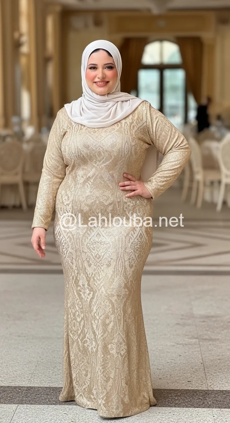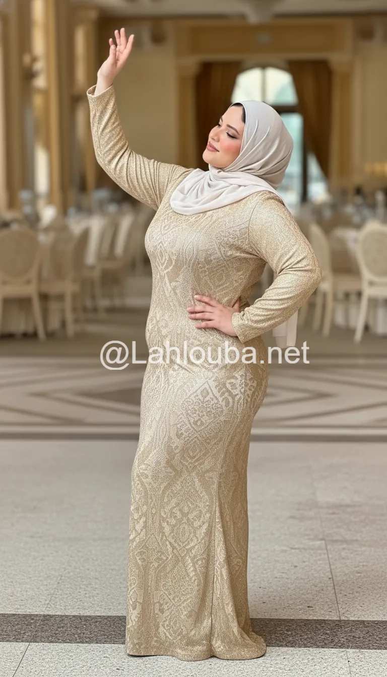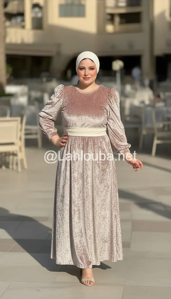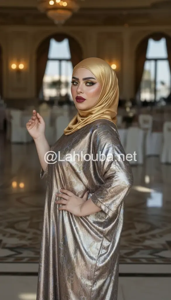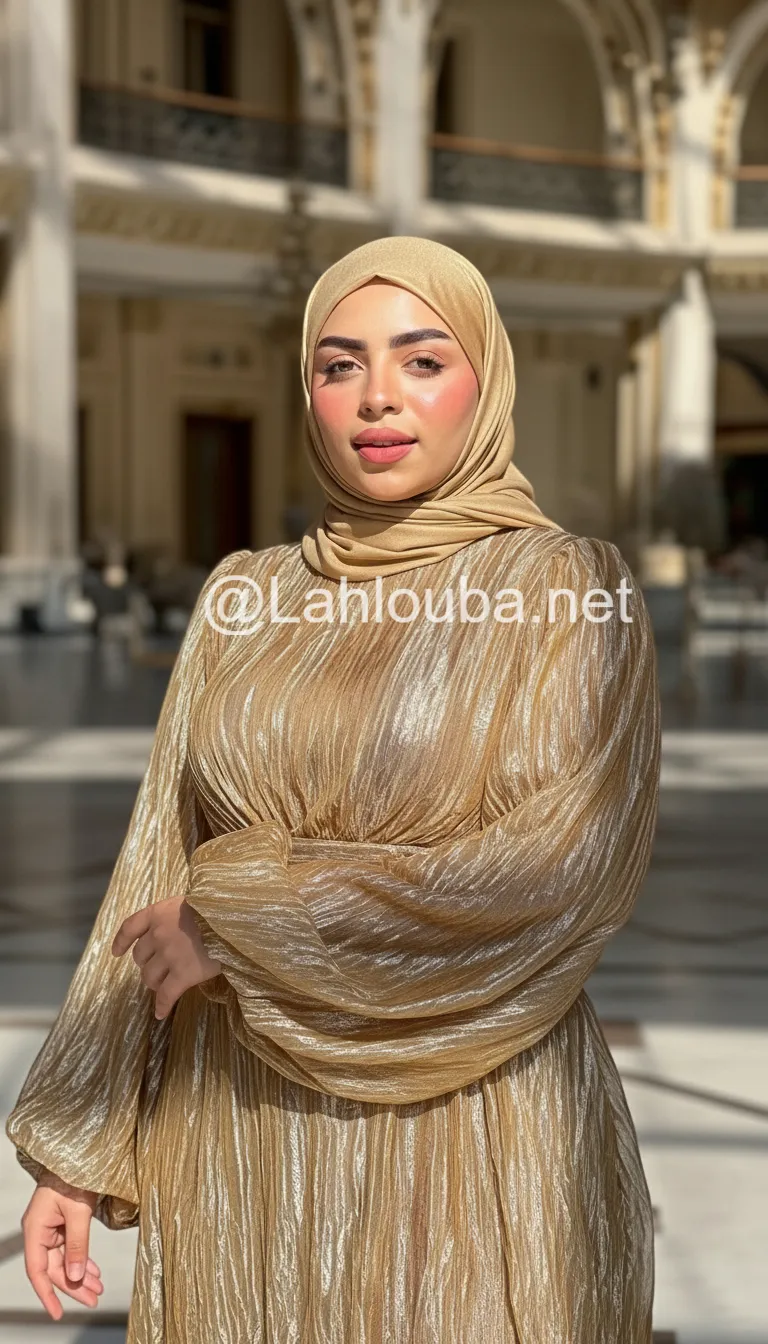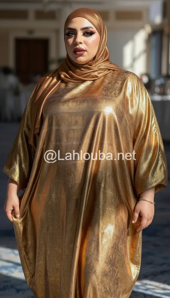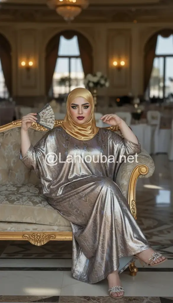 نقطة القوة: الأناقة المريحة . هذه الإطلالة مثالية لمن تبحث عن الفخامة والراحة في آن واحد. القصة الفضفاضة محتشمة جداً، واللون الذهبي يجعلها مناسبة لسهرة أو استقبال.