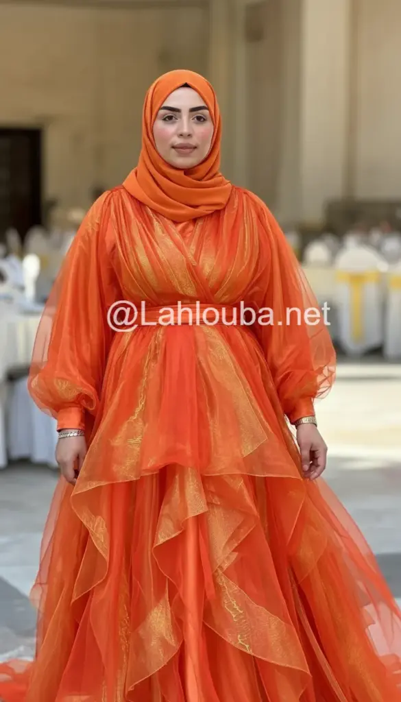 الوصف: فستان سهرة من طبقات متعددة من الأورجانزا والشيفون باللون البرتقالي، مع لمسات ذهبية خفيفة وقصة عند الخصر.