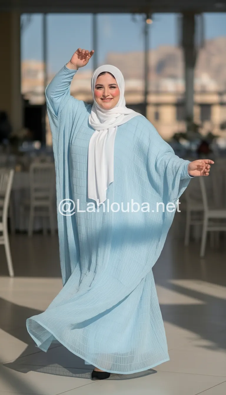 الوصف: عباءة أو فستان واسع جداً بلون أزرق سماوي من خامة مجعدة .