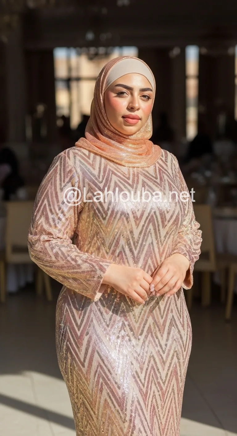 الوصف: فستان سهرة ضيق بأكمام طويلة، مغطى بالكامل بالترتر باللون الذهبي الوردي بنقشة شيفرون .