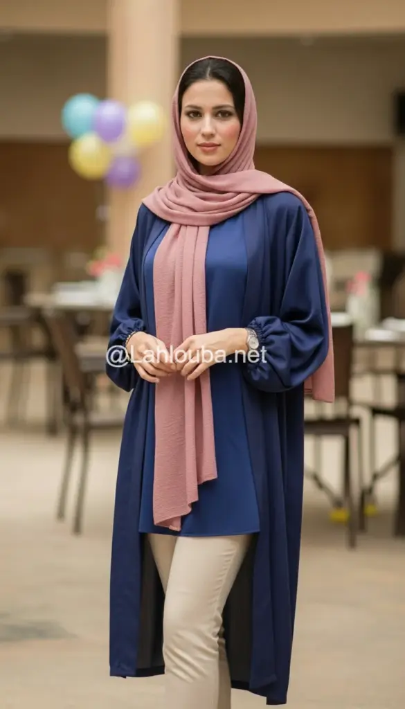 لإطلالة ناعمة ومحتشمة، يمكنكِ اعتماد الكارديجان الكحلي الطويل فوق طقم أساسي بلوزة كحلية وبنطلون “أوف وايت”. الإضافة الأبرز هنا هي الحجاب باللون الوردي الباهت مما يجعل تنسيق اللون الكحلي للمحجبات اسهل بسبب كثرة الملابس من هذه الالوان(Dusty Pink) الذي يكسر حدة اللون الكحلي ويمنح الإطلالة لمسة أنثوية هادئة.