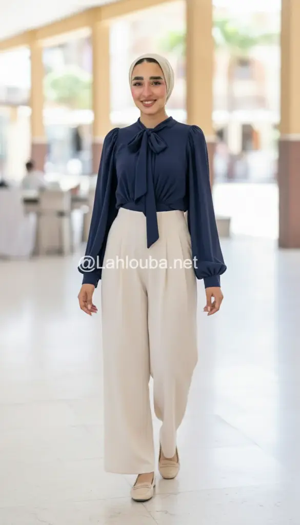 تنسيق كلاسيكي راقٍ لا يخطئ أبداً. بلوزة شيفون كحلية بفيونكة أنيقة على الرقبة، مع بنطلون “أوف وايت” واسع (Wide Leg). هذه الإطلالة مثالية لاجتماعات العمل أو للمناسبات التي تتطلب مظهراً رسمياً ناعماً.