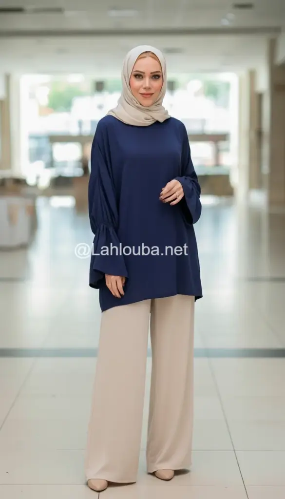 إذا كنتِ تبحثين عن الراحة والأناقة في آن واحد، فهذا التونيك الكحلي بقصة “الأوفر سايز” وأكمام “البيشوب” (Bishop) هو خيارك. تم تنسيقه هنا مع بنطلون بيج واسع وحجاب بلون متناغم، ليمنحكِ إطلالة عملية ومريحة للتسوق أو الزيارات العائلية.