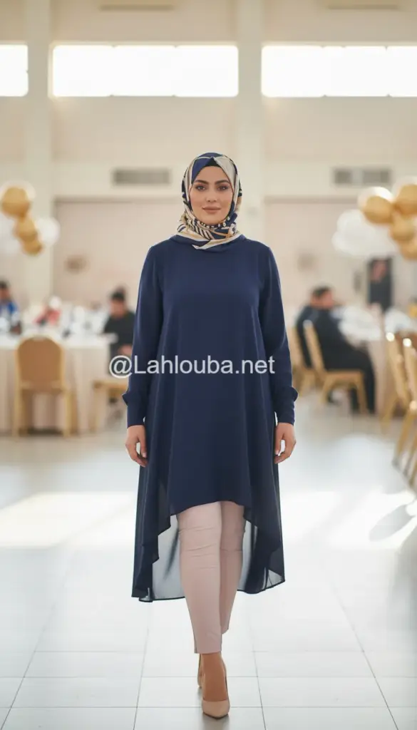 لإطلالة عصرية، اختاري تونيك كحلي بقصة الـ “High-Low” (قصير من الأمام وطويل من الخلف). هذا التصميم رائع مع البناطيل الضيقة (Skinny). في هذه الصورة، تم تنسيقه بجرأة مع بنطلون باللون الوردي الفاتح، مما خلق تبايناً لونياً جذاباً.