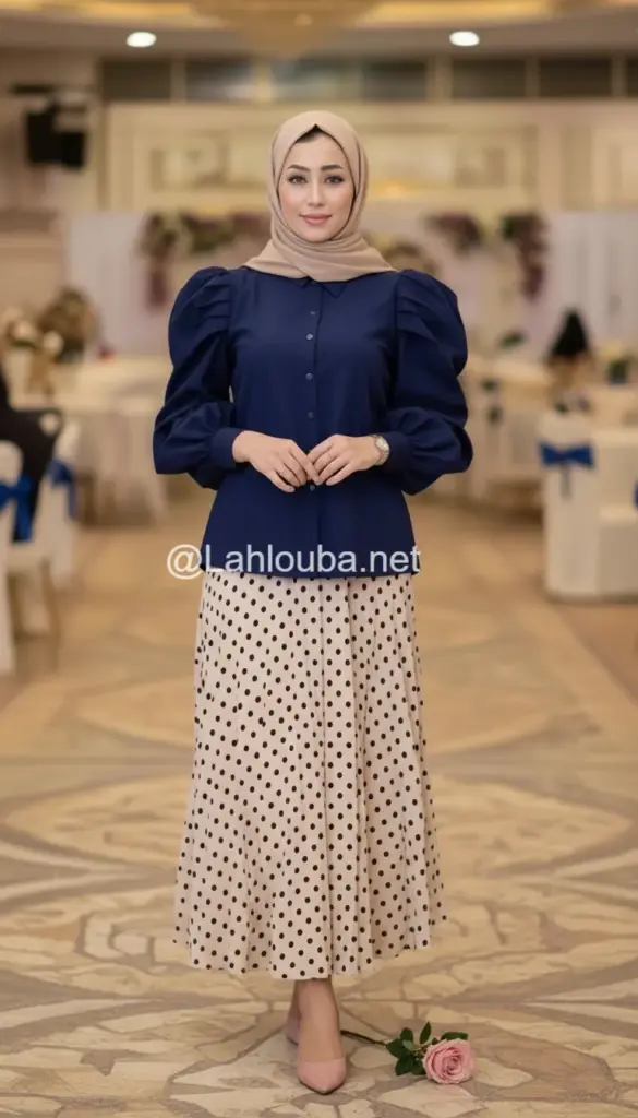 لا تخافي من دمج الكحلي مع النقوش. هذه البلوزة الكحلية ذات الأكمام المنفوشة (Puff Sleeves) تبدو رائعة مع جيبة كلاسيكية بنقشة “البولكا دوت” (المنقطة) باللونين البيج والأسود. إطلالة أنيقة بلمسة كلاسيكية.