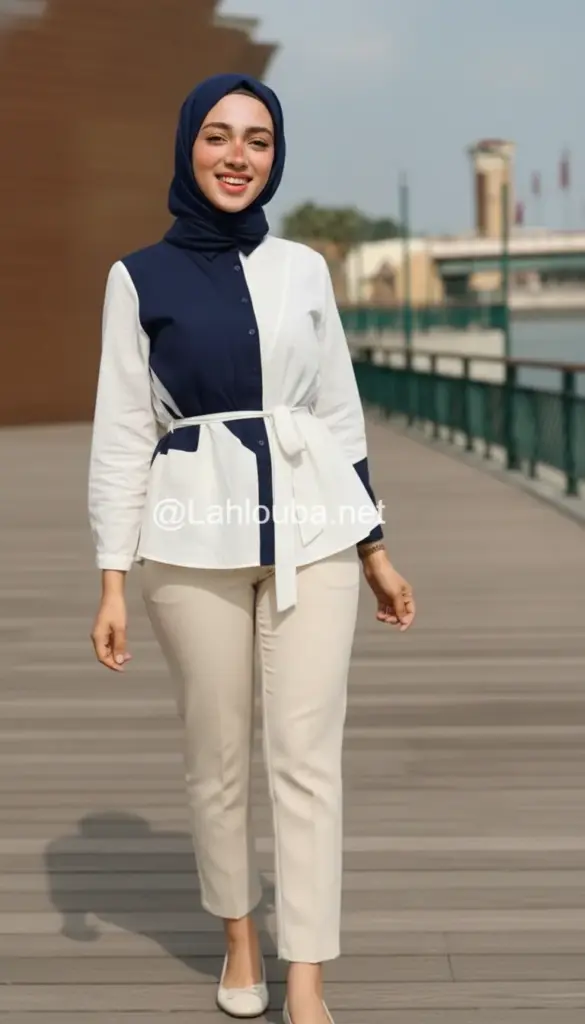 تصميم عصري ومختلف لقميص مقسوم باللونين الكحلي والأبيض. تم تنسيقه مع بنطلون بيج فاتح وحجاب كحلي لإكمال اللوحة اللونية. الحزام الأبيض المدمج يحدد القوام ويجعل الإطلالة “كاجوال شيك” بامتياز.