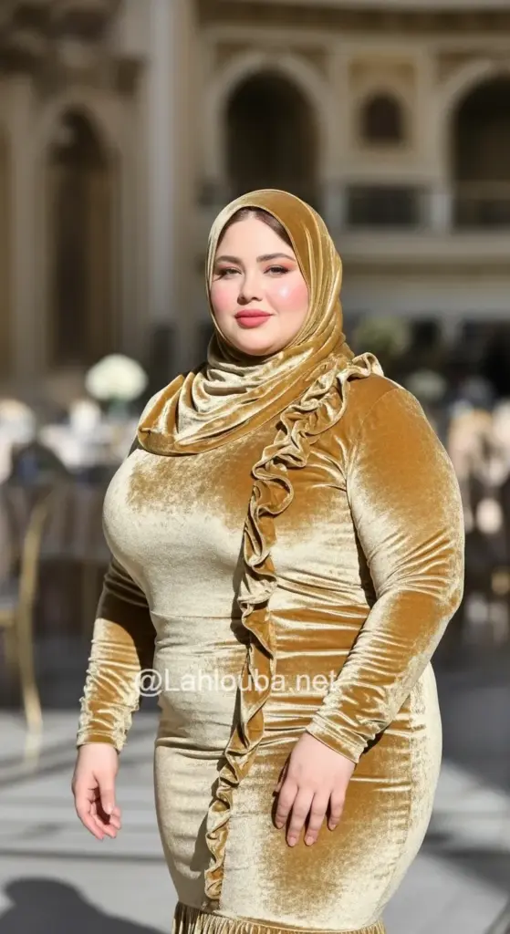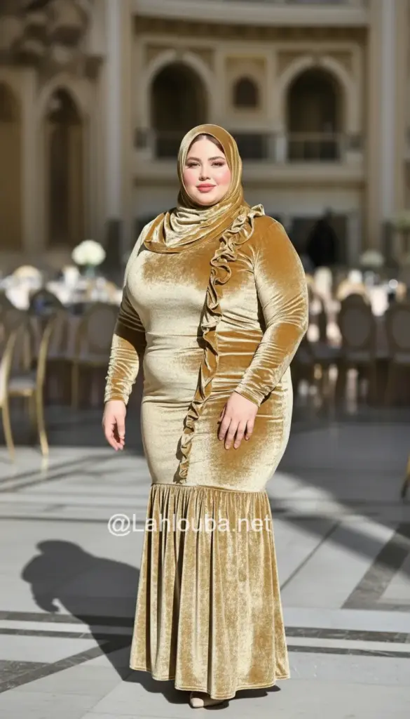 الوصف: فستان من المخمل بلون ذهبي-خردلي، يتميز برقبة عالية ملتفة (Cowl neck)، وقصة “ميرميد” تنتهي باتساع بسيط، مع كشكشة طولية جانبية.