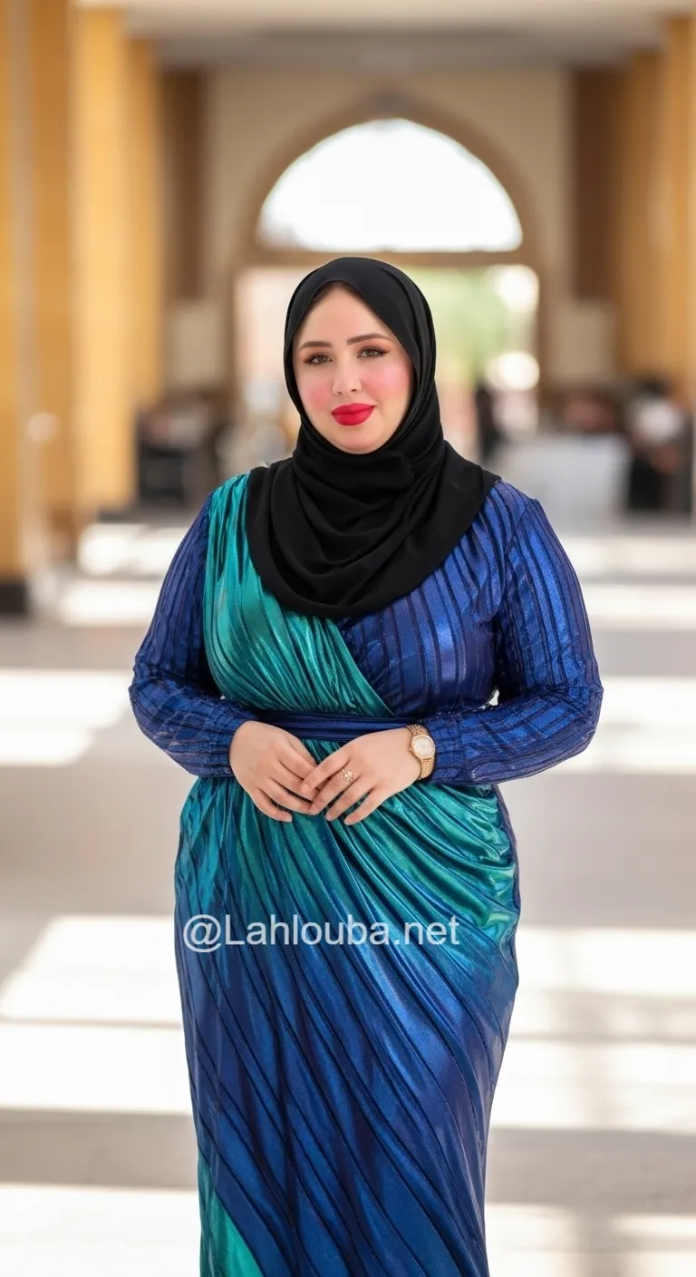 نقطة القوة: القماش نفسه هو بطل الإطلالة. القصة البسيطة تترك المجال للون والخامة للتألق. تنسيق الحجاب من نفس القماش يخلق مظهراً انسيابياً وطويلاً.