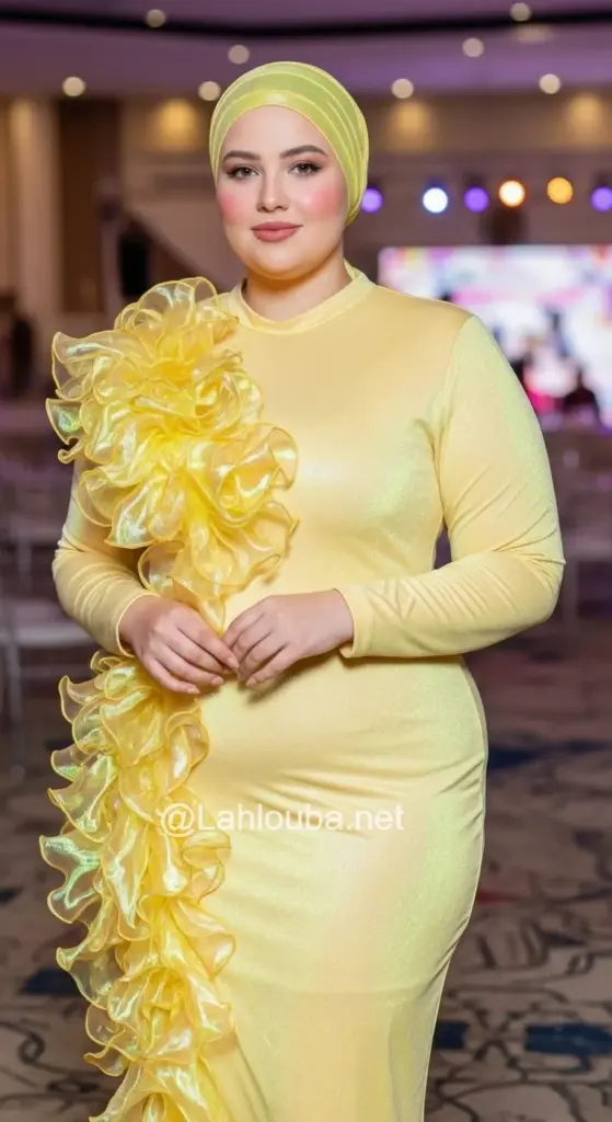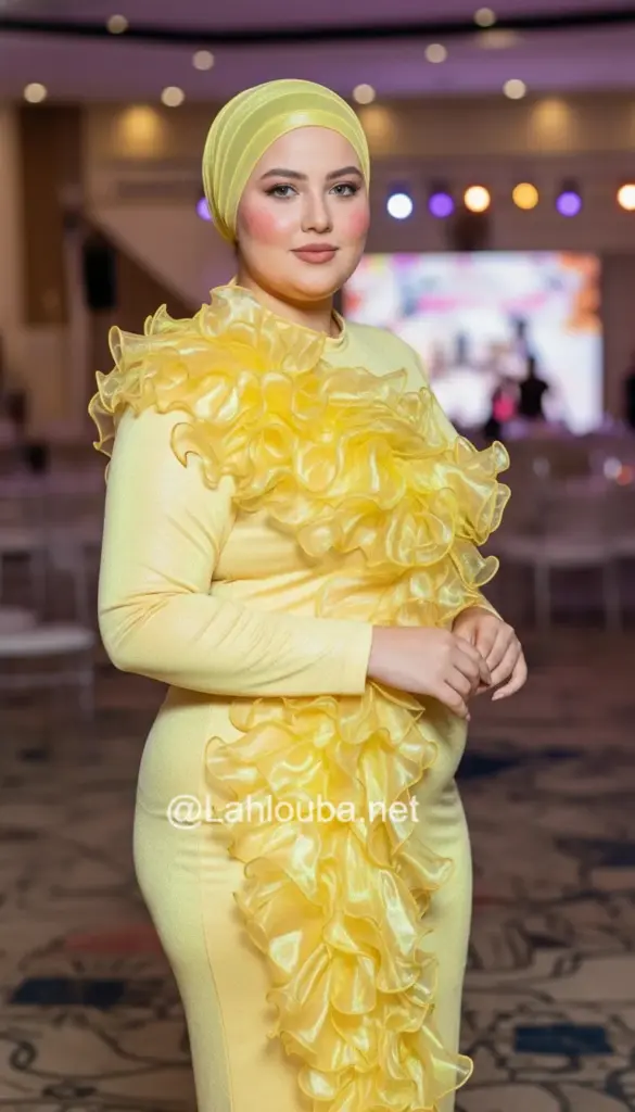 الوصف: فستان أصفر كناري بقصة ضيقة، مع تفصيل ضخم من الكشكشة (من خامة الأورجانزا غالباً) يمتد بشكل قطري عبر الجسم.