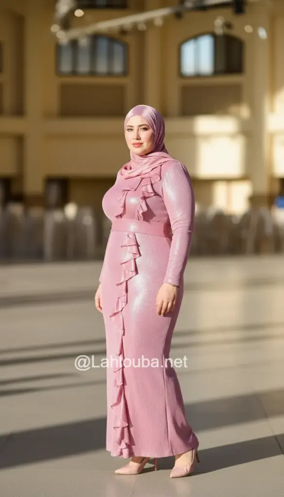 الوصف: فستان وردي لامع بقصة ضيقة، تزينه تفاصيل كشكشة تمتد بشكل عمودي من الأعلى للأسفل.