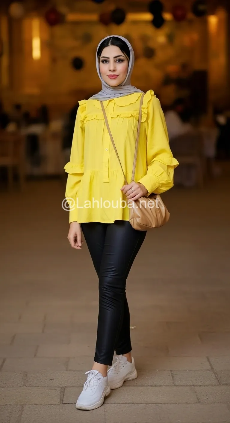 محجبة ترتدي بلوزة صفراء انيقة مع بنطلون جلد