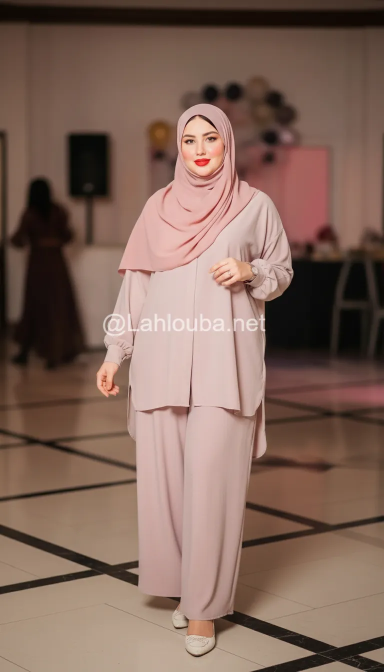 تعتبر الأطقم الموحدة (Co-ord sets) من أسهل الخيارات الأنيقة. طقم باللون “الدستي روز” (Dusty Rose) مكون من تونيك طويل فضفاض وبنطلون واسع. إطلالة ناعمة ومحتشمة لا تحتاج لأي مجهود في التنسيق.