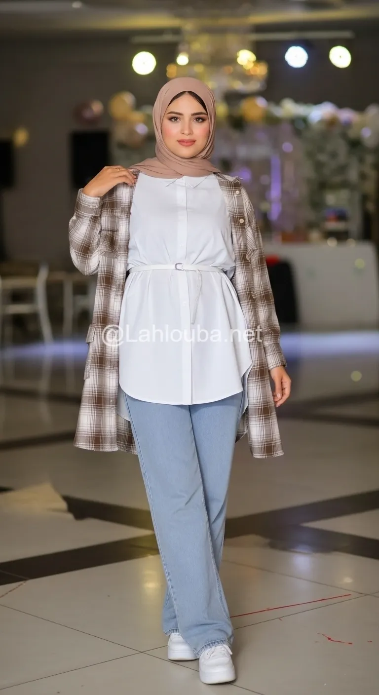 إطلالة شبابية وعملية تعتمد على “الطبقات”. قميص أبيض طويل مع حزام أبيض، منسق مع بنطلون جينز أزرق فاتح بقصة مستقيمة. إضافة القميص الكاروه (Plaid) المفتوح كطبقة علوية يمنح الإطلالة طابعاً كاجوال ومميزاً.