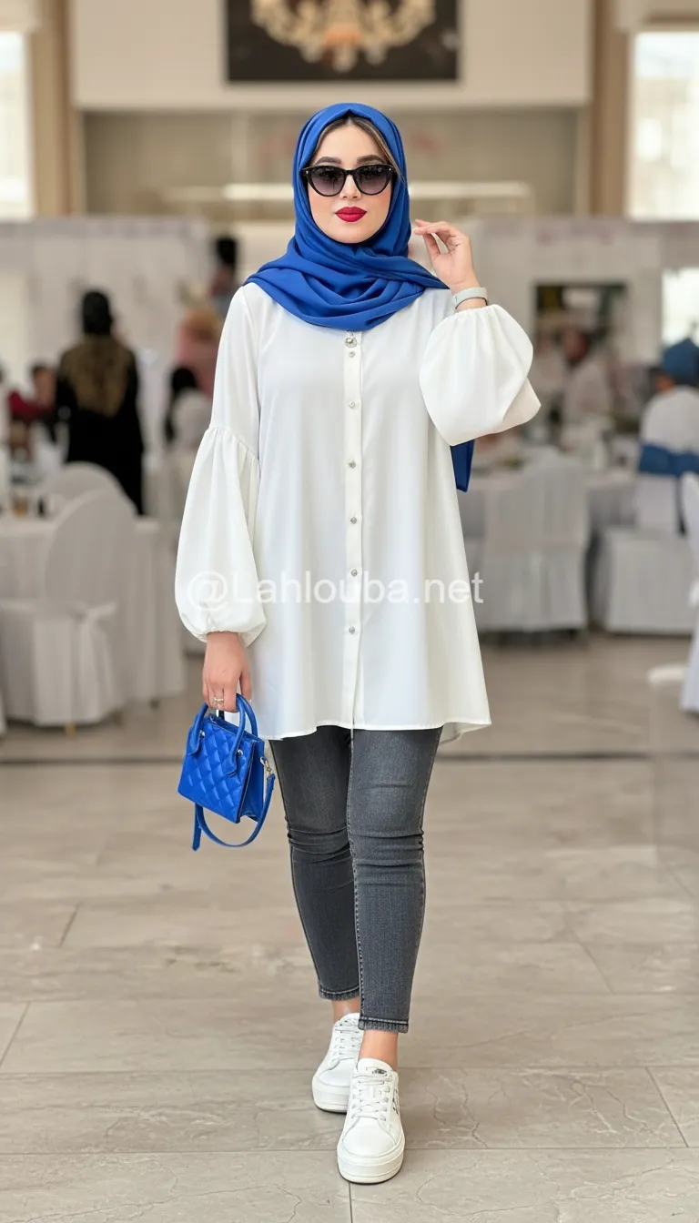 أحياناً البساطة هي سر الأناقة. بلوزة بيضاء فضفاضة بأكمام بالون مميزة، منسقة مع بنطلون جينز سكيني (Skinny) باللون الرمادي. اللمسة الجريئة هنا هي الحجاب والحقيبة باللون الأزرق الملكي، مما يخلق تبايناً لونياً جذاباً.