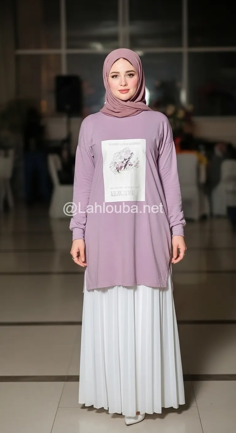 مزيج رائع بين “السبورتي” و “الأنثوي”. سويت شيرت (Sweatshirt) طويل باللون الموف الفاتح، منسق فوق تنورة “بليسيه” (Pleated) بيضاء. إطلالة مريحة، محتشمة، وعصرية جداً تناسب الجامعة والخروجات النهارية.