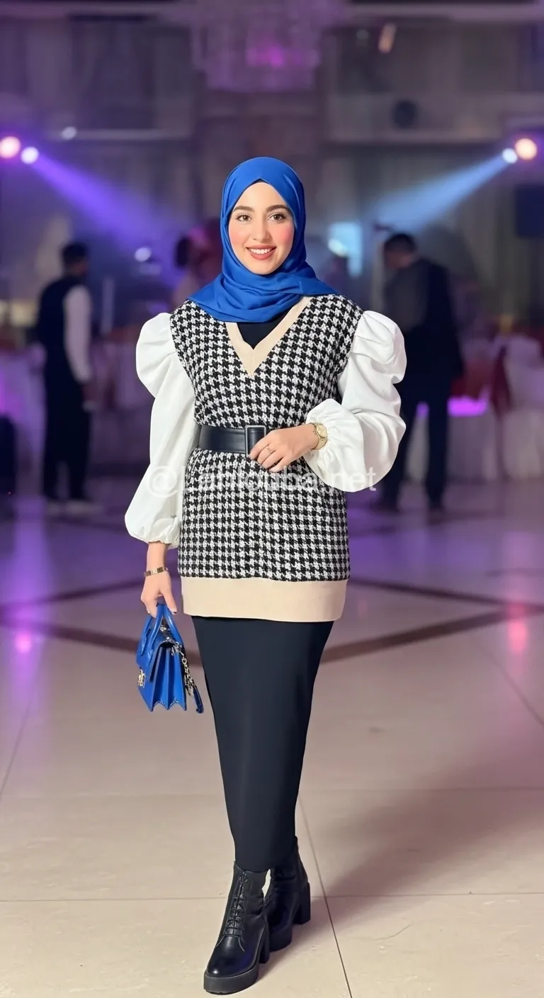 إطلالة عصرية تجمع بين الكلاسيكية والجرأة. قميص أبيض بأكمام بالون (Balloon Sleeves) منسق مع “فيست” (Vest) بنقشة الهاوندستوث. تم تنسيق اللوك مع تنورة سوداء وحزام أسود عريض لتحديد الخصر، مع “بوت” (Boot) أسود لإكمال الأناقة.