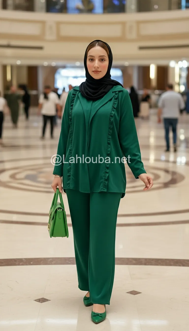 لإطلالة قوية وأنيقة، لا شيء يضاهي “المونوكروم” (الإطلالة باللون الواحد). بدلة باللون الأخضر الزمردي مكونة من بليزر بتفاصيل كشكشة وبنطلون واسع. تنسيق الحقيبة والحذاء بنفس اللون يكمل هذه الإطلالة الفخمة وهنا نختم مقالنا عن ملابس محجبات للخروج 2026 واتمني ان تنال ااعجابكن.