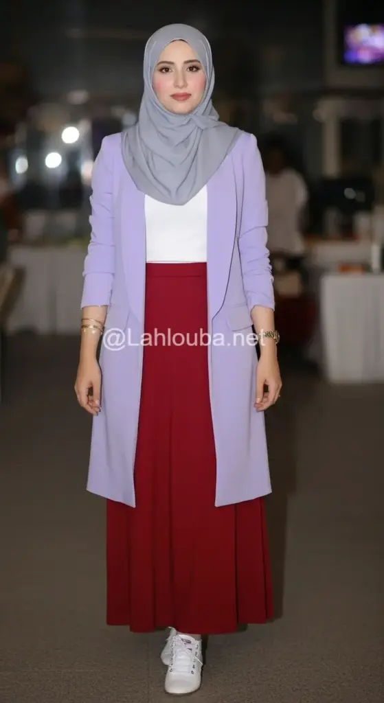 تنسيق أنيق يكسر القواعد. بليزر طويل باللون “اللاڤندر” (Lavender) منسق مع توب أبيض وتنورة “ماكسي” باللون الأحمر. اللمسة العصرية هي ارتداء حذاء رياضي أبيض، مما يحول الإطلالة من رسمية إلى “سمارت كاجوال” بامتياز.